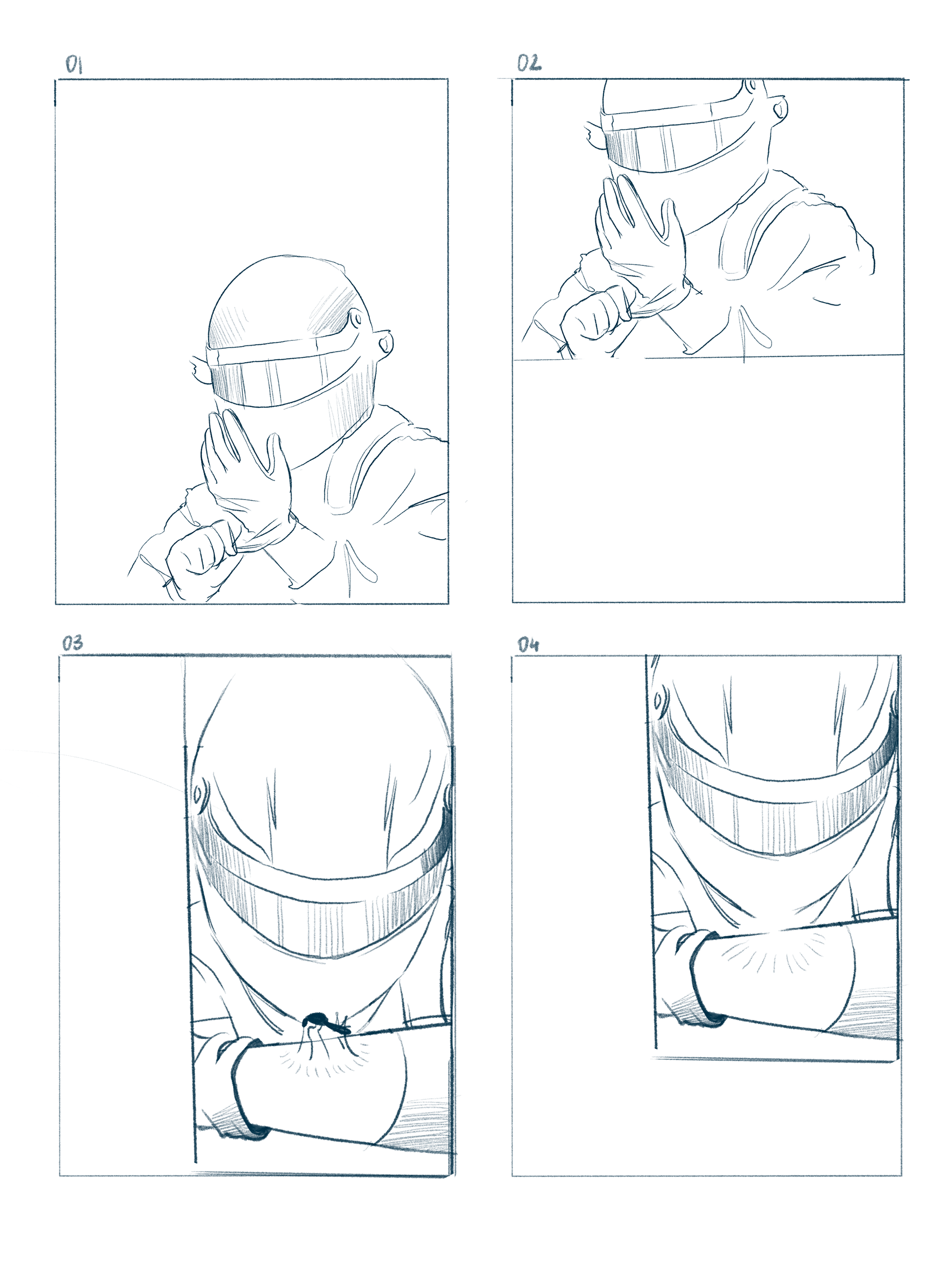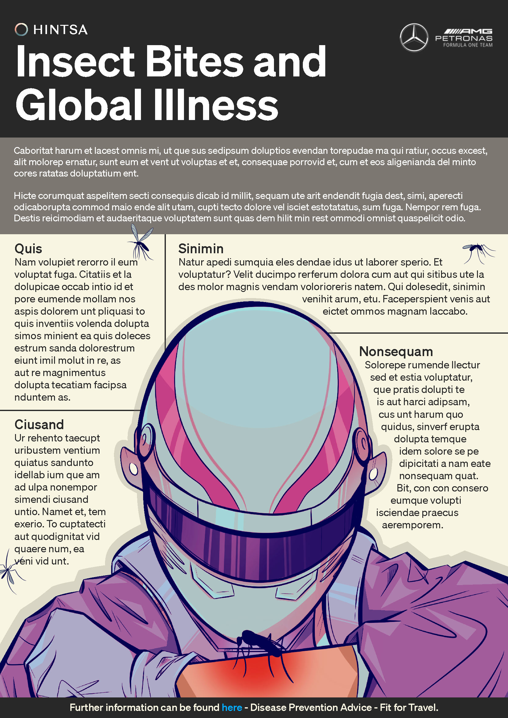 I created several scamps to explore various compositional concepts. The overarching goal was to centre the driver as the focal point while emphasising the thematic core of the infographic which in this case was the bite and insect.